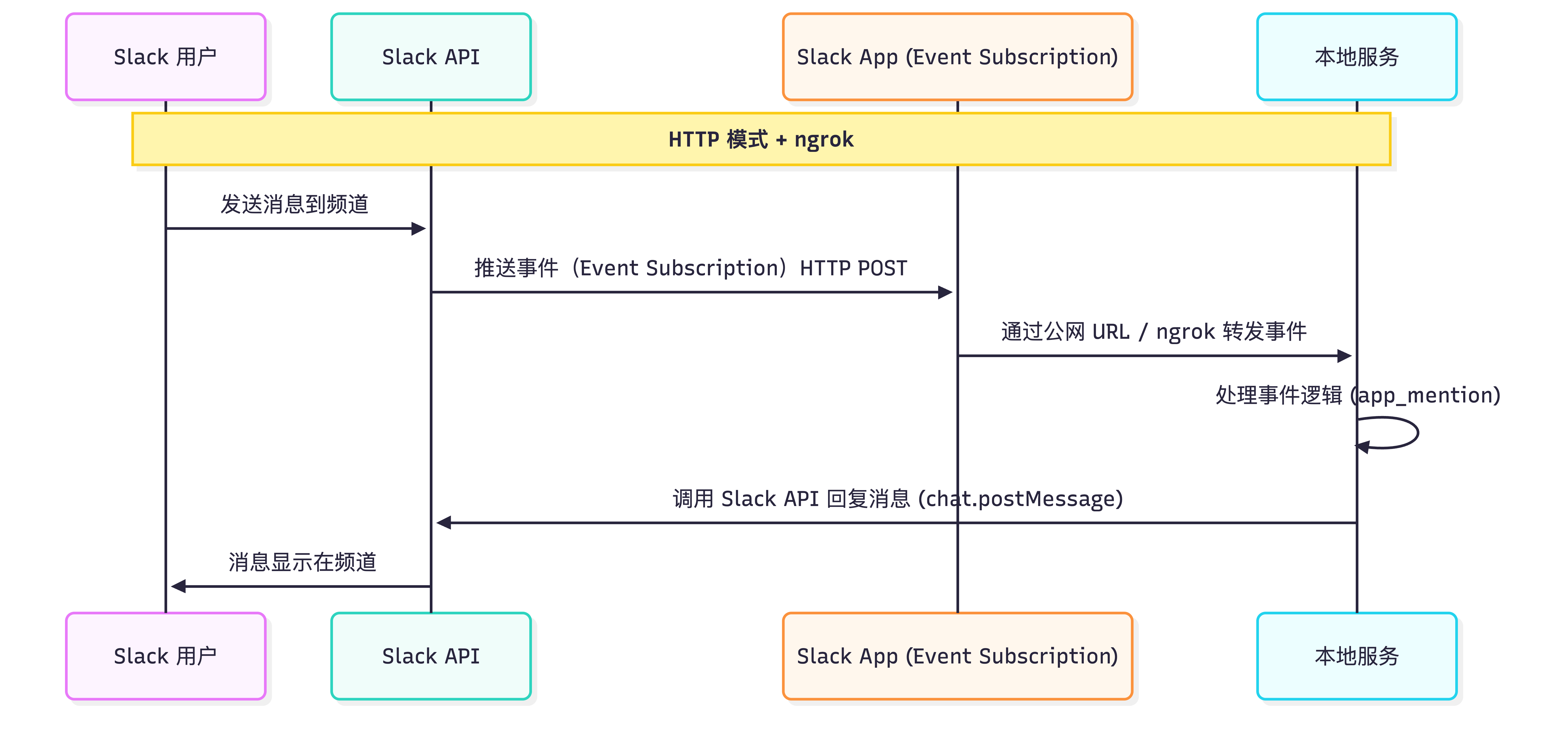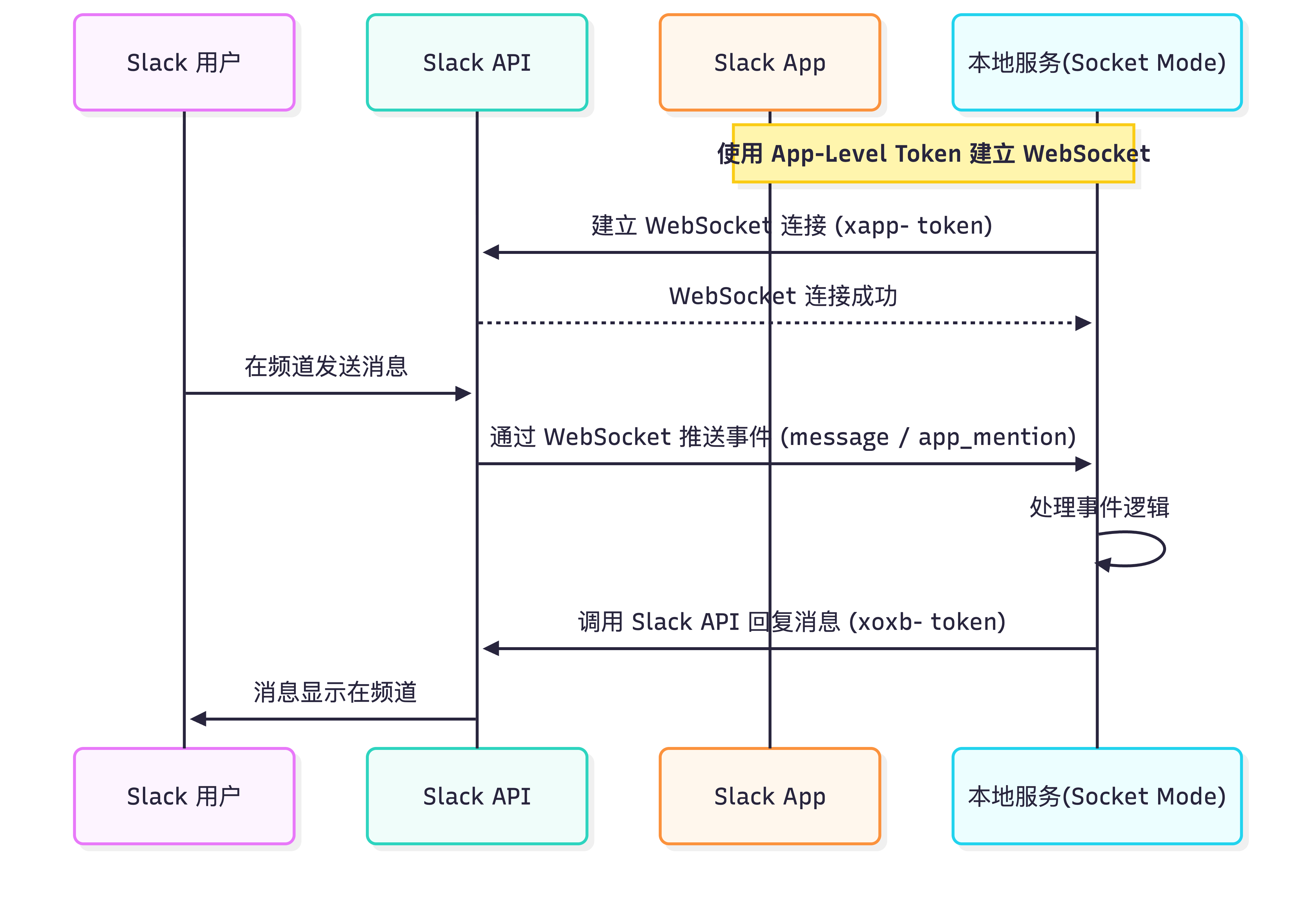 这个模式通过 App-Level Token 和 Bot Token 来连接 Slack App 和 我们的服务: